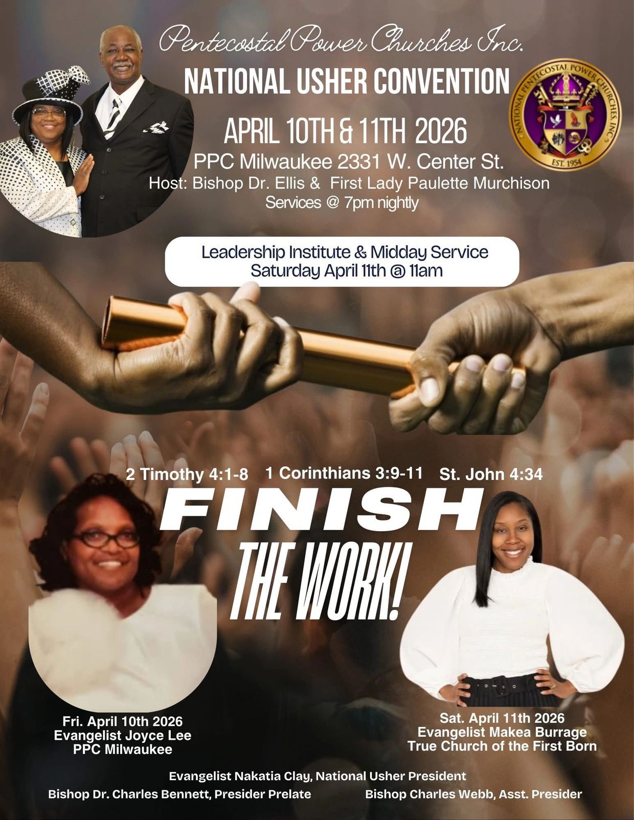 In 1981 the Pentecostal Power Churches Inc. held their annual Pentecost Convention in Benton Harbor MI, under the leadership of Bishop Willis Baker. The National Usher Department was then organized by Brother Gillis Tripplett of St. Louis, Mo. who was under the leadership of Bishop McMichael. Officers were appointed to assist Brother Tripplett which included Missionary Mary Tombs as vice president and Sister Emma Triplett as secretary and treasurer. There were many other general ushers throughout the organization. In 1986 during the National Convention in St. Louis Mo. the Board of Bishops established that Tuesday of each National Convention would be recognized as National Usher’s Day. This was a monumental leap for the National Usher Department. Decades later, the department continues to grow to new heights despite world and economic challenges. There are currently more than 40 ushers throughout the organization and with the help of God, we will continue to build and grow.